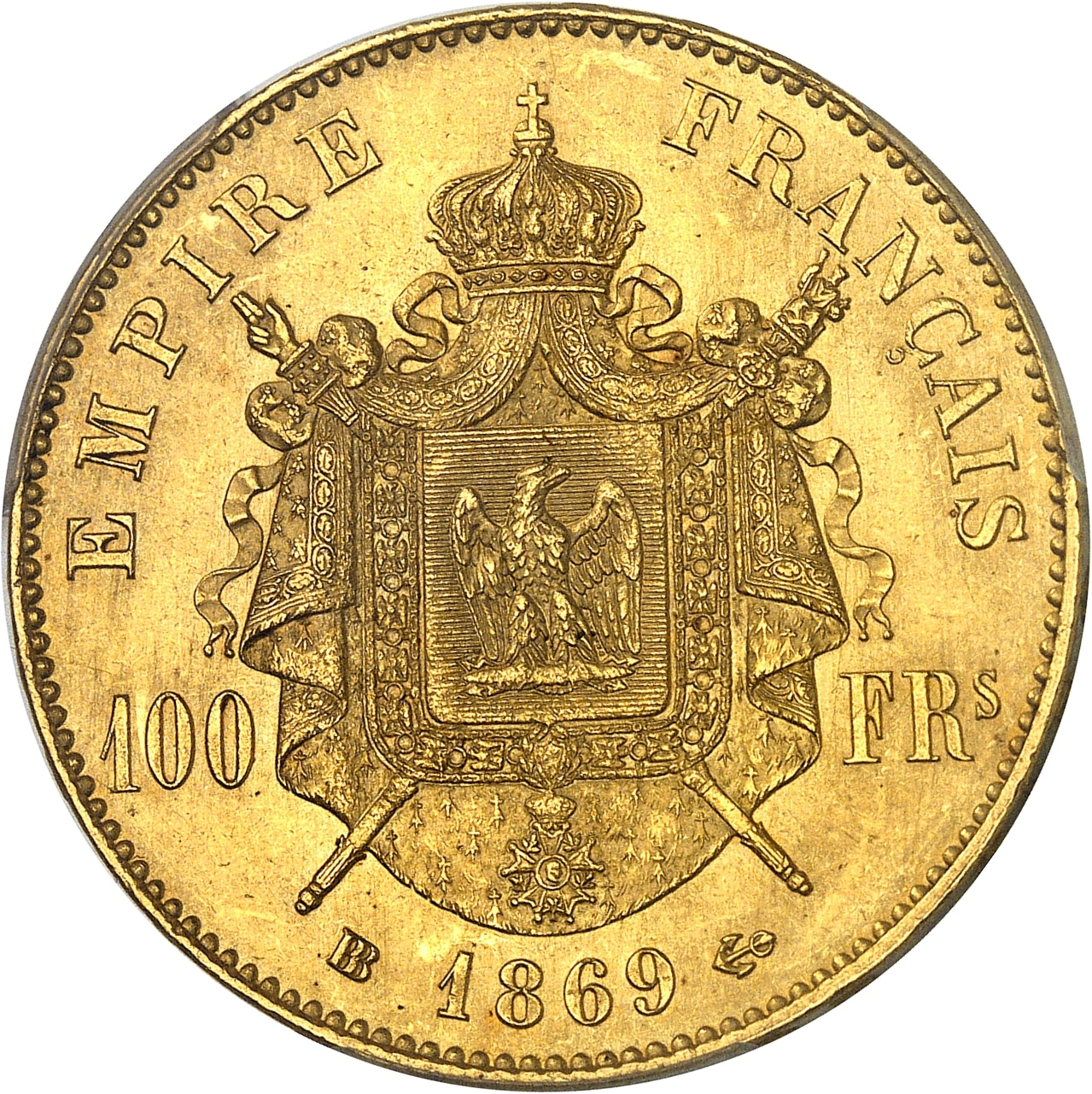 - Second Empire / Napoléon III (1852-1870). 100 francs tête laurée 1869, BB, Strasbourg.