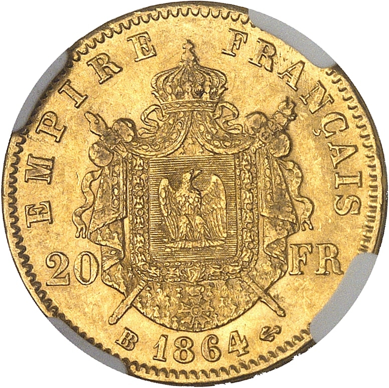 - Second Empire / Napoléon III (1852-1870). 20 francs tête laurée 1864, BB, Strasbourg.