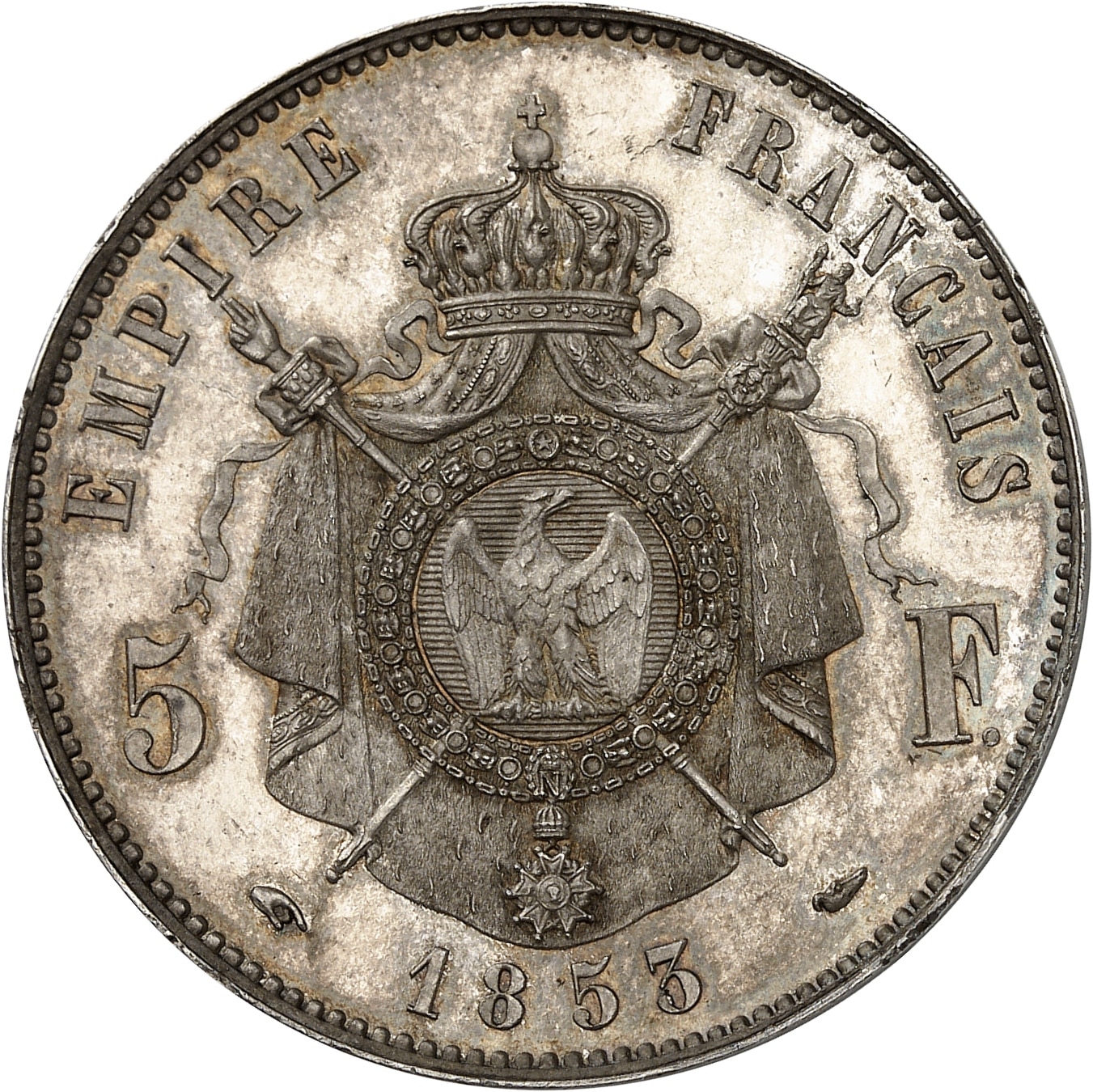 Rv. EMPIRE FRANCAIS. Armes impériales posées sur un manteau couronné et brochant sur le sceptre et la main de justice, accostées de 5 - F et au-dessous (différent) (date) (différent).