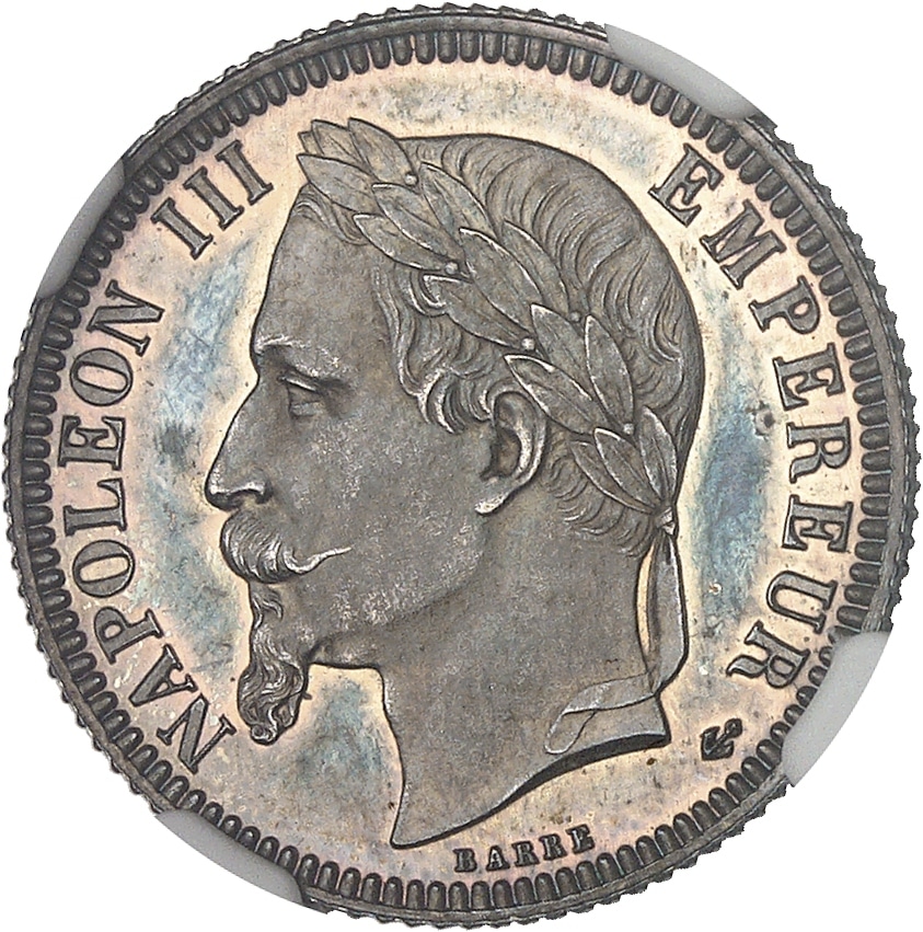 - Second Empire / Napoléon III (1852-1870). Prototype de 1 franc tête laurée, tranche cannelée, Flan bruni (PROOF) 1860, Paris.