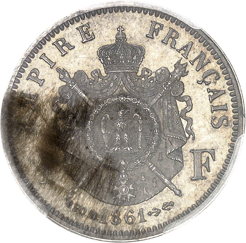 - Second Empire / Napoléon III (1852-1870). Essai de 1 franc tête laurée, 850 M[illièmes], tranche lisse, Frappe spéciale (SP) 1861, E, Paris.