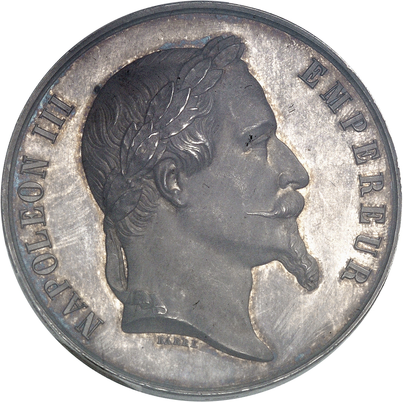 Av. NAPOLEON III - EMPEREUR. Tête laurée à droite de l'Empereur ; signature BARRE.