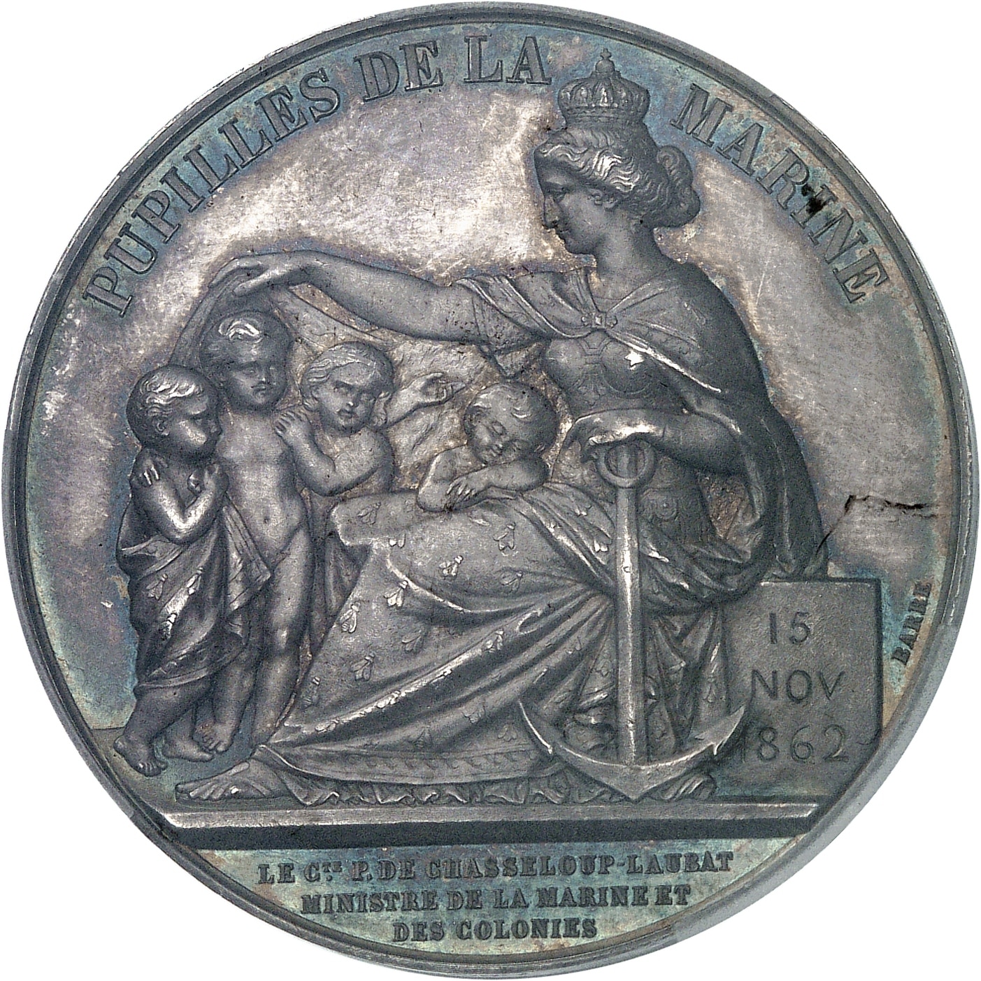 Rv. PUPILLES DE LA - MARINE. La France, assise sur un bloc daté du 15 NOV 1862, le bras gauche sur une ancre, recouvre de son bras droit 4 orphelins. À l'exergue LE Cte P. DE CHASSELOUP-LAUBAT/ MINISTRE DE LA MARINE ET/ DES COLONIES ; signature BARRE.