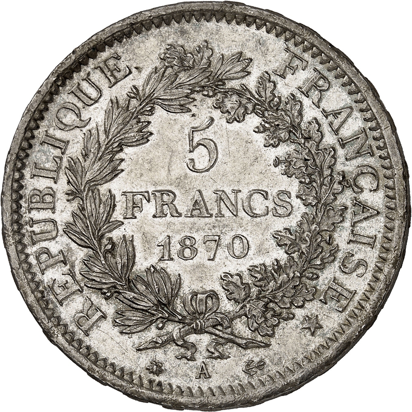 - Gouvernement de Défense Nationale (1870-1871). 5 francs Hercule 1870, A, Paris.