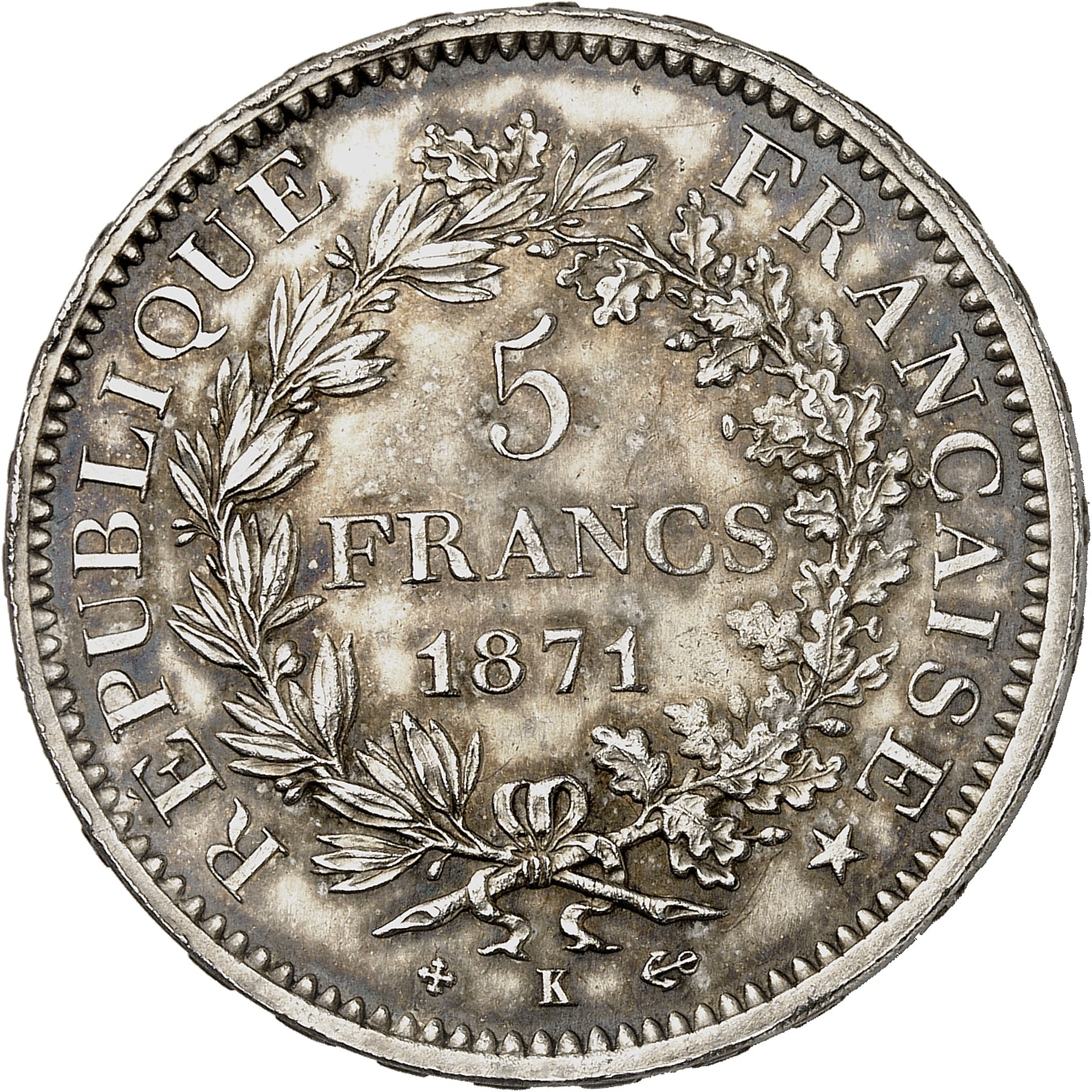 - Gouvernement de Défense Nationale (1870-1871). 5 francs Hercule 1871, K, Bordeaux.