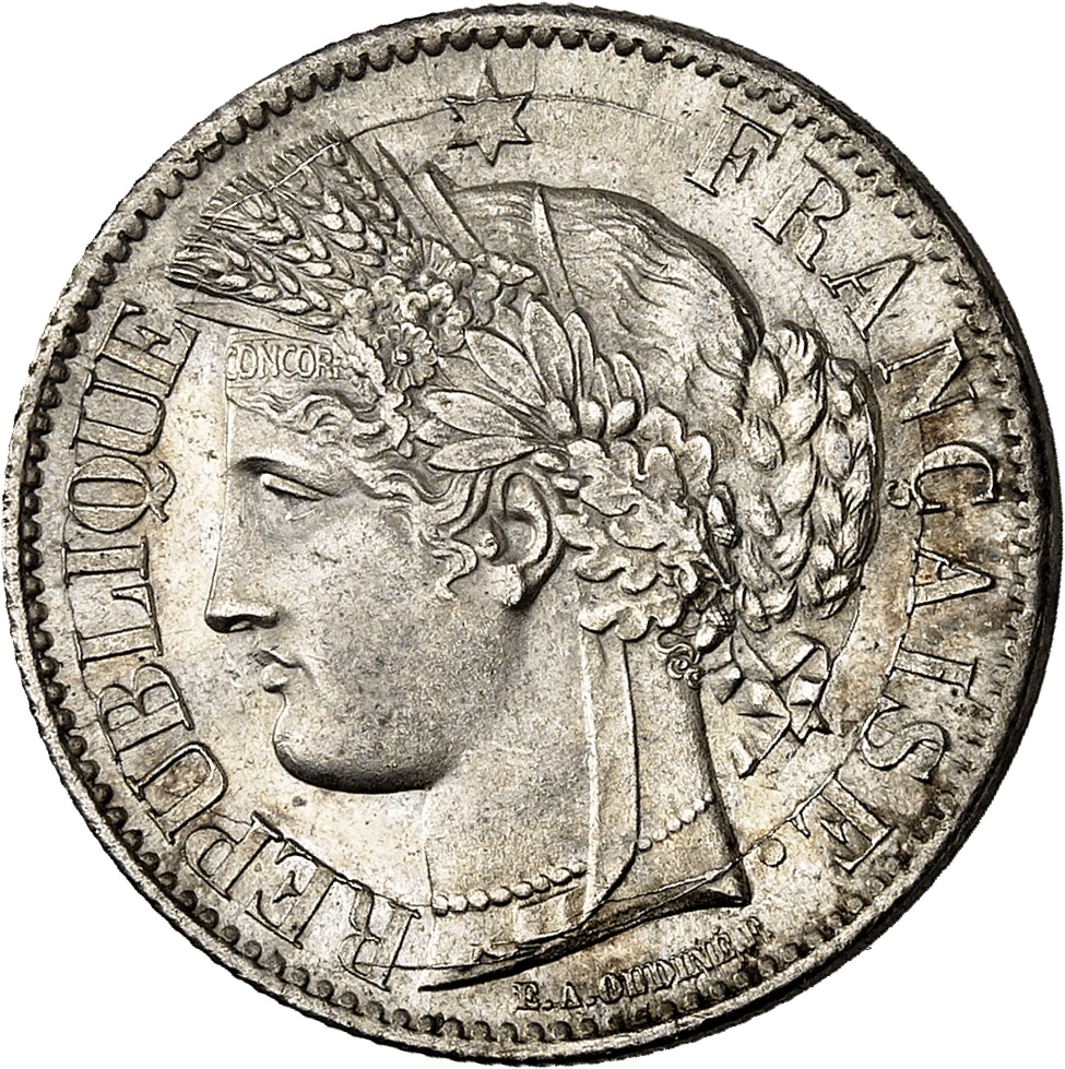 Av. RÉPUBLIQUE FRANÇAISE. Tête de la République à gauche en Cérès, sous une étoile ; au-dessous signature E. A. OUDINÉ. F.