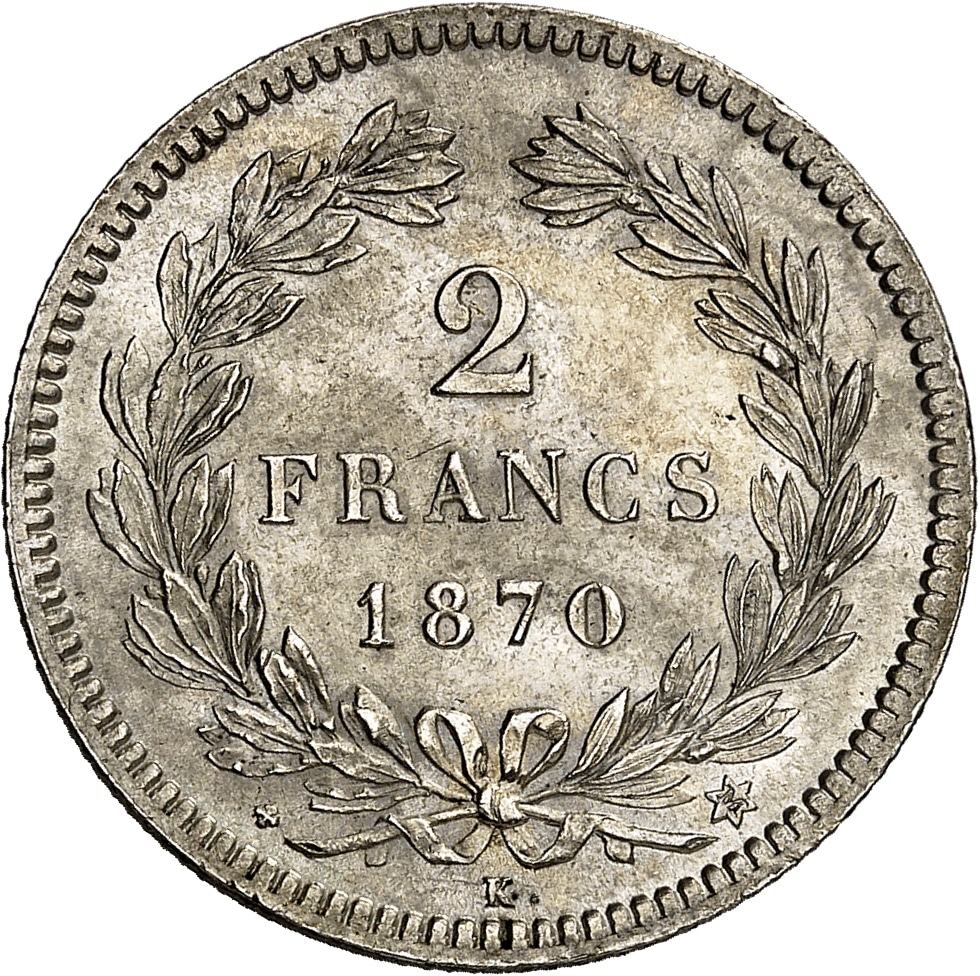 - Gouvernement de Défense Nationale (1870-1871). 2 francs Cérès, sans légende 1870, K, Bordeaux.
