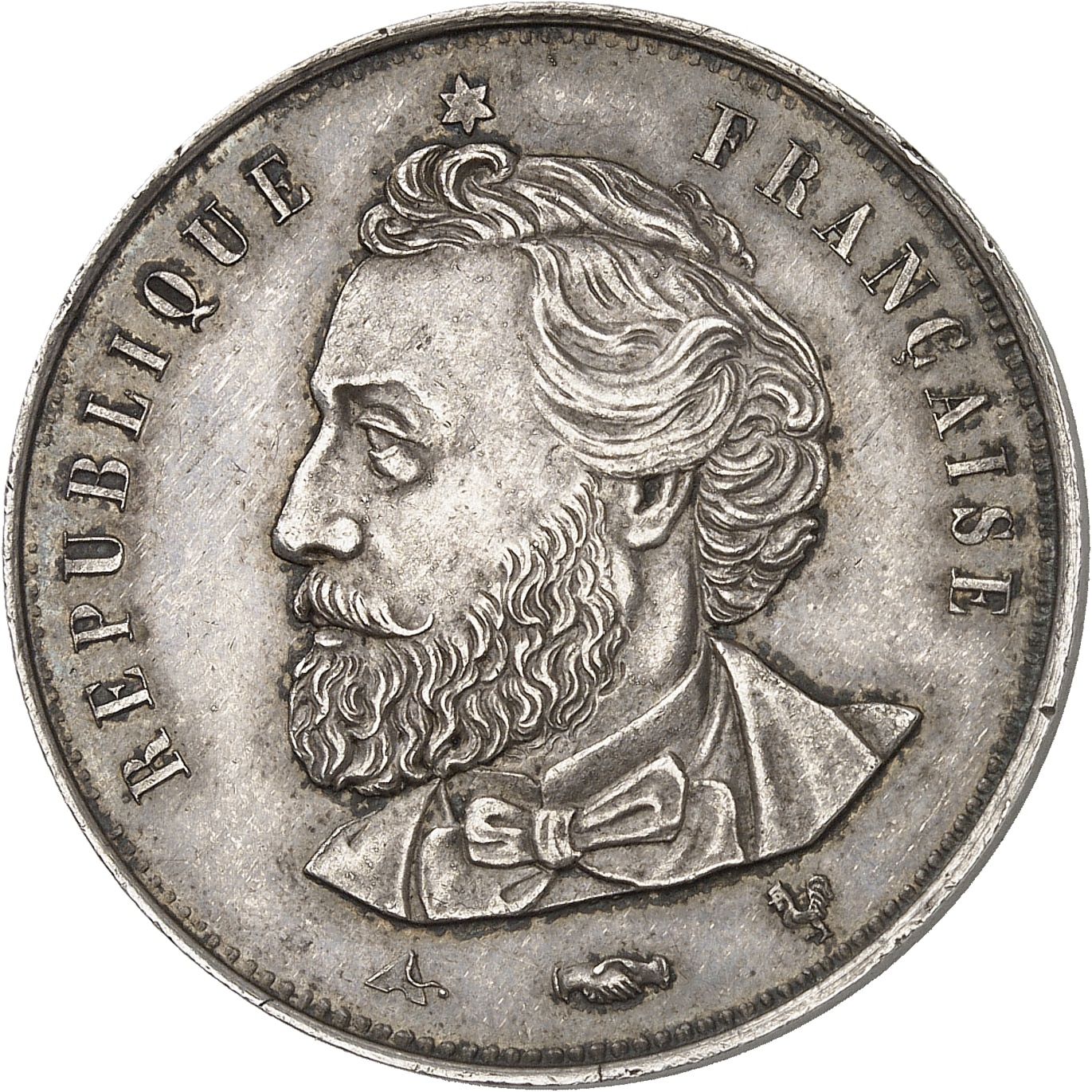 Av. RÉPUBLIQUE FRANÇAISE. Buste de Gambetta à gauche sous une étoile ; au-dessous : niveau, mains jointes et coq.