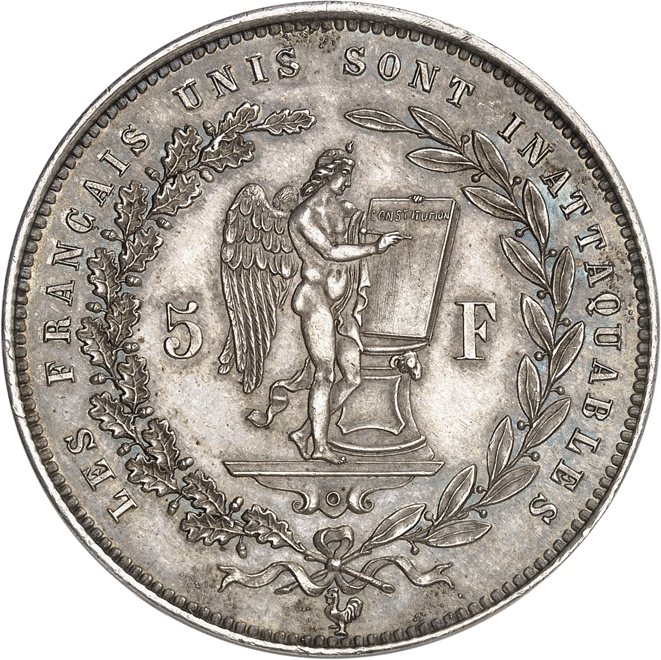 Rv. LES FRANÇAIS UNIS SONT INATTAQUABLES. Dans une couronne formée d’une branche de chêne et d’une branche de laurier, sur un entablement, un Génie à droite inscrivant le mot CONSTITUTION sur une table, accosté de 5 - F ; à l’exergue, un coq.