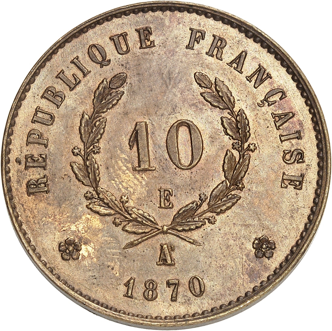 - Gouvernement de Défense Nationale (1870-1871). Essai [avec E] de 10 (centimes) au ballon, tranche lisse, Frappe spéciale (SP) 1870, A, Paris.