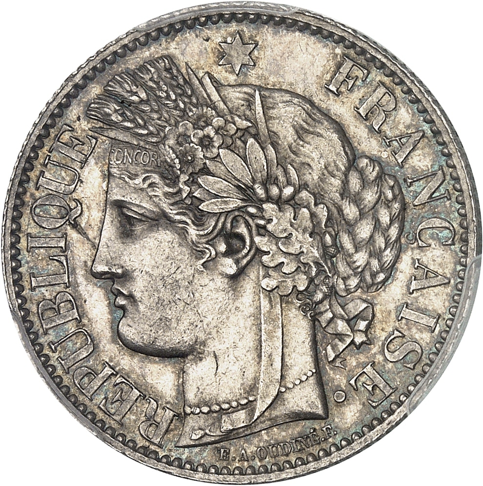Av. RÉPUBLIQUE FRANÇAISE. Tête de la République à gauche en Cérès, sous une étoile ; au-dessous signature E. A. OUDINÉ. F.
