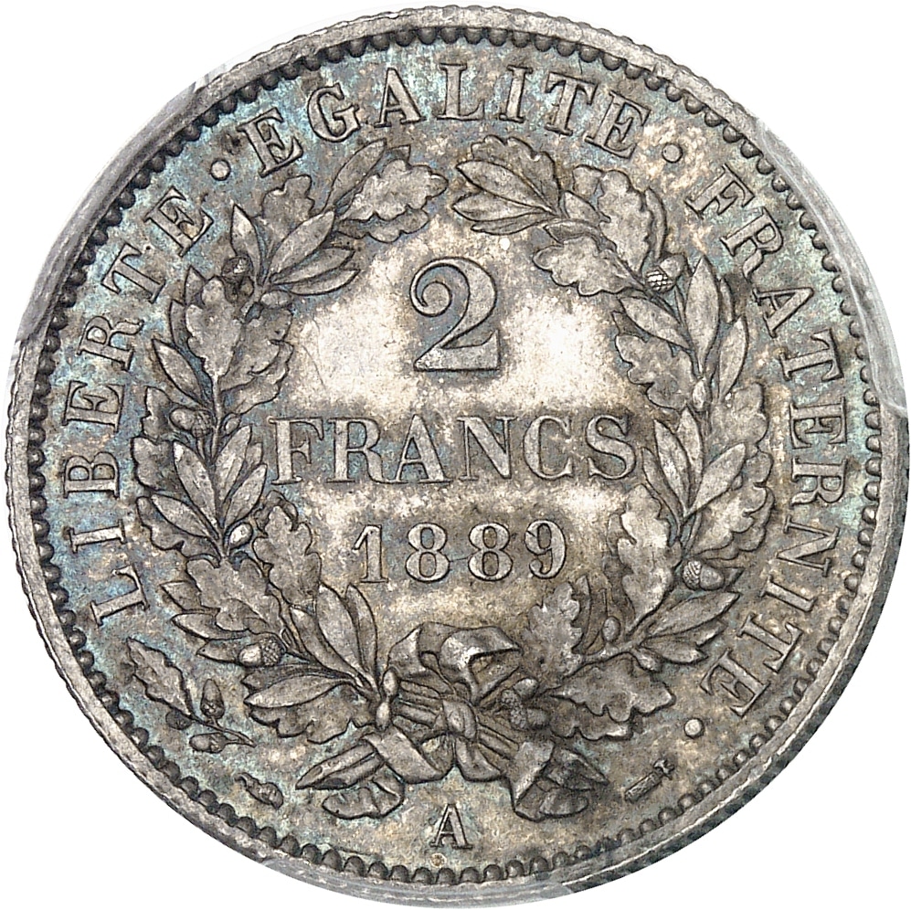 - IIIe République (1870-1940). 2 francs Cérès, Flan bruni (PROOF) 1889, A, Paris.