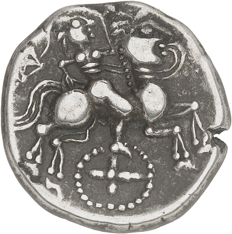 Rv. Cheval androcéphale à droite, conduit par son aurige tenant les rênes ; sous le cheval une roue perlée à quatre rayons ; l’aurige tient un cordon terminé par un vexillum avec pendeloques au-dessus de la queue du cheval ; une rosace perlée devant le cheval.