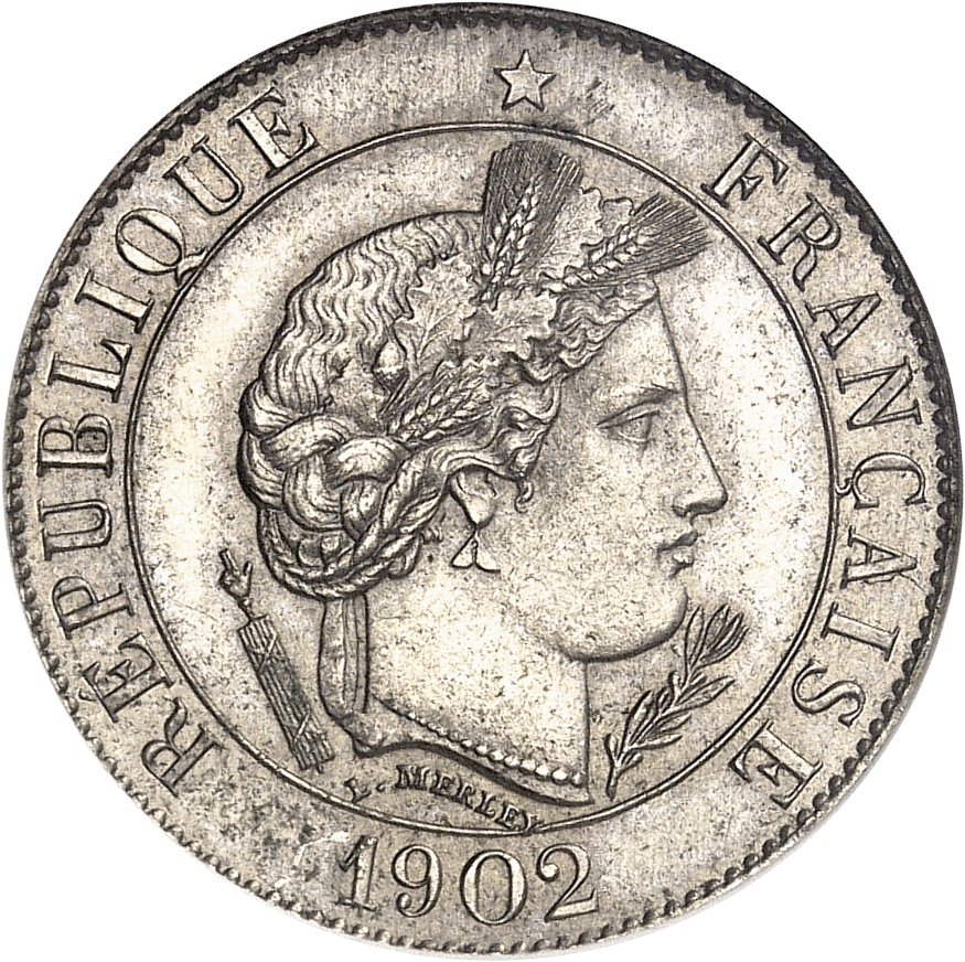Av. RÉPUBLIQUE * FRANÇAISE. Tête couronnée de la République à droite, avec collier de perles, entre un faisceau et une branche d’olivier ; au-dessous signature arrondie L. MERLEY et (date).