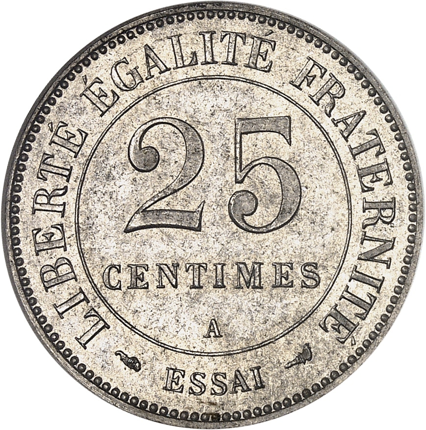 Rv. LIBERTÉ ÉGALITÉ FRATERNITÉ. Au centre : 25 CENTIMES (atelier) et à l’exergue (différent) ESSAI (différent).