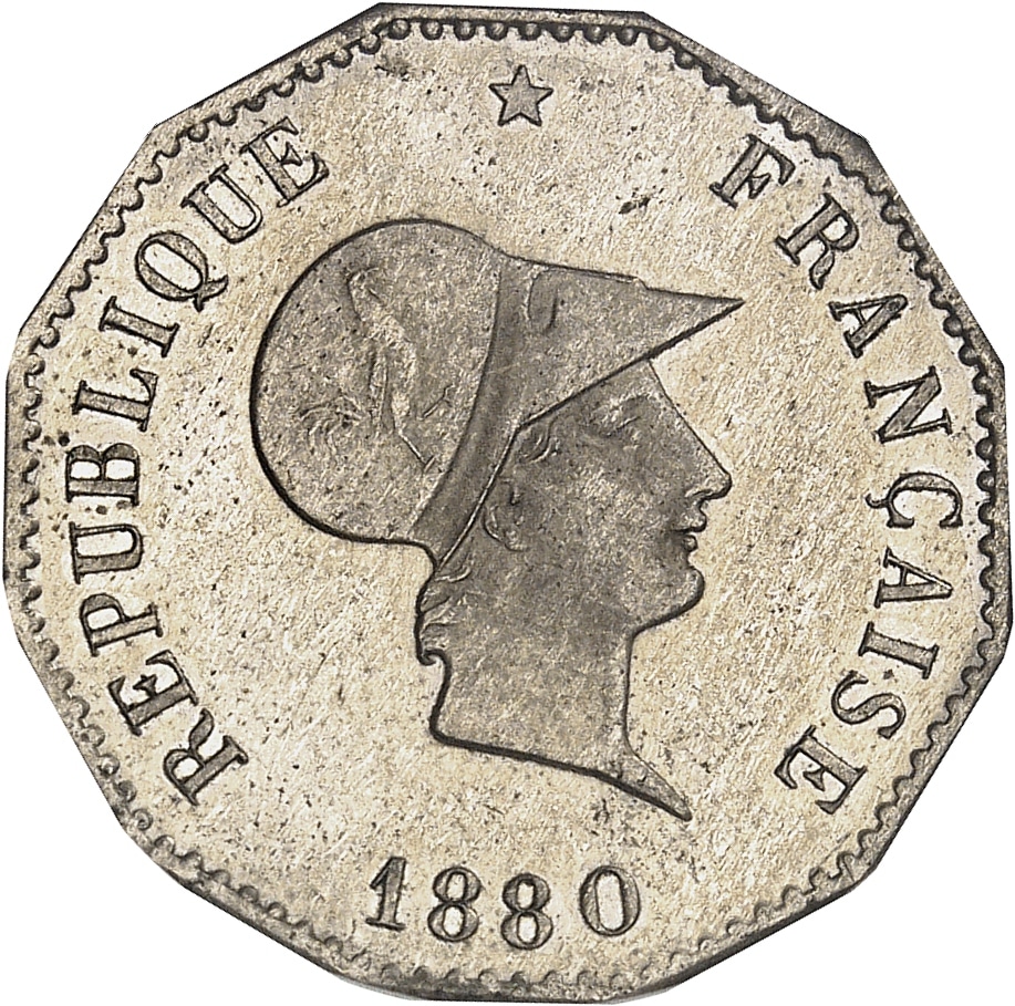 - IIIe République (1870-1940). Essai de 20 centimes en maillechort, d’après Lorthior, flan dodécagonal 1880, A, Paris.