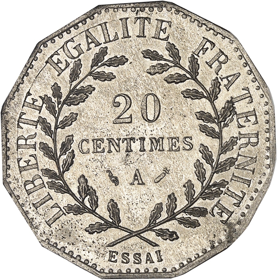 Rv. LIBERTÉ ÉGALITÉ FRATERNITÉ. Dans une couronne formée de deux branches de chêne : 20 CENTIMES (différent) (atelier) (différent) et au-dessous ESSAI.