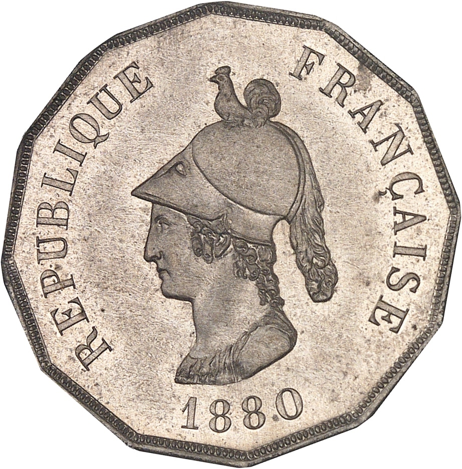 - IIIe République (1870-1940). Essai de 20 centimes en maillechort, d’après Lorthior, flan dodécagonal 1880, A, Paris.