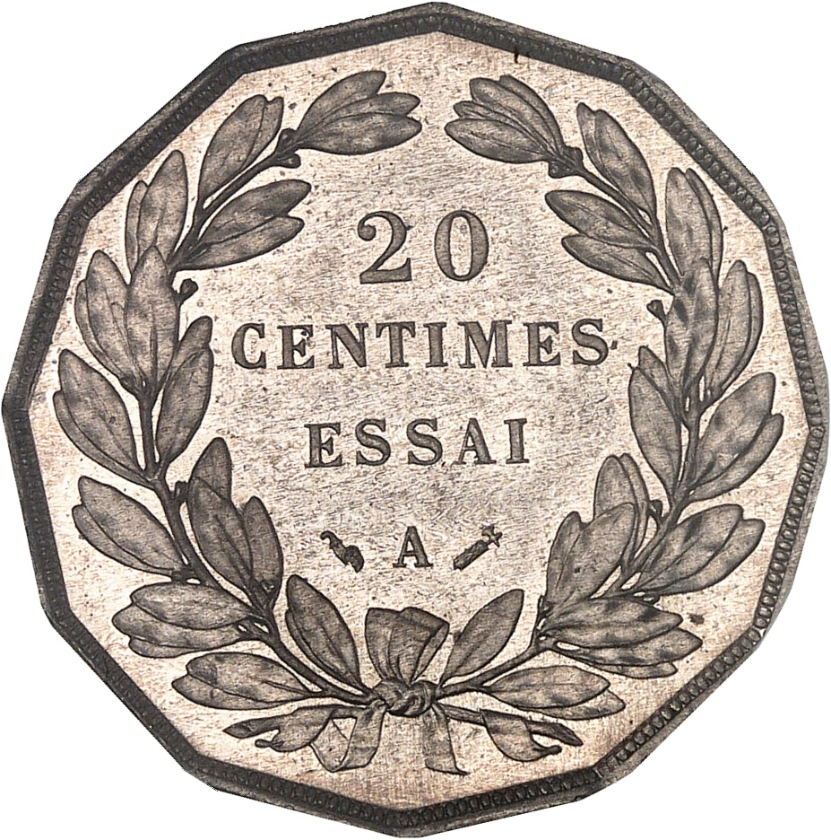 Rv. Dans une couronne formée de deux branches de laurier, en quatre lignes : 20 CENTIMES ESSAI et (différent) (atelier) (différent).