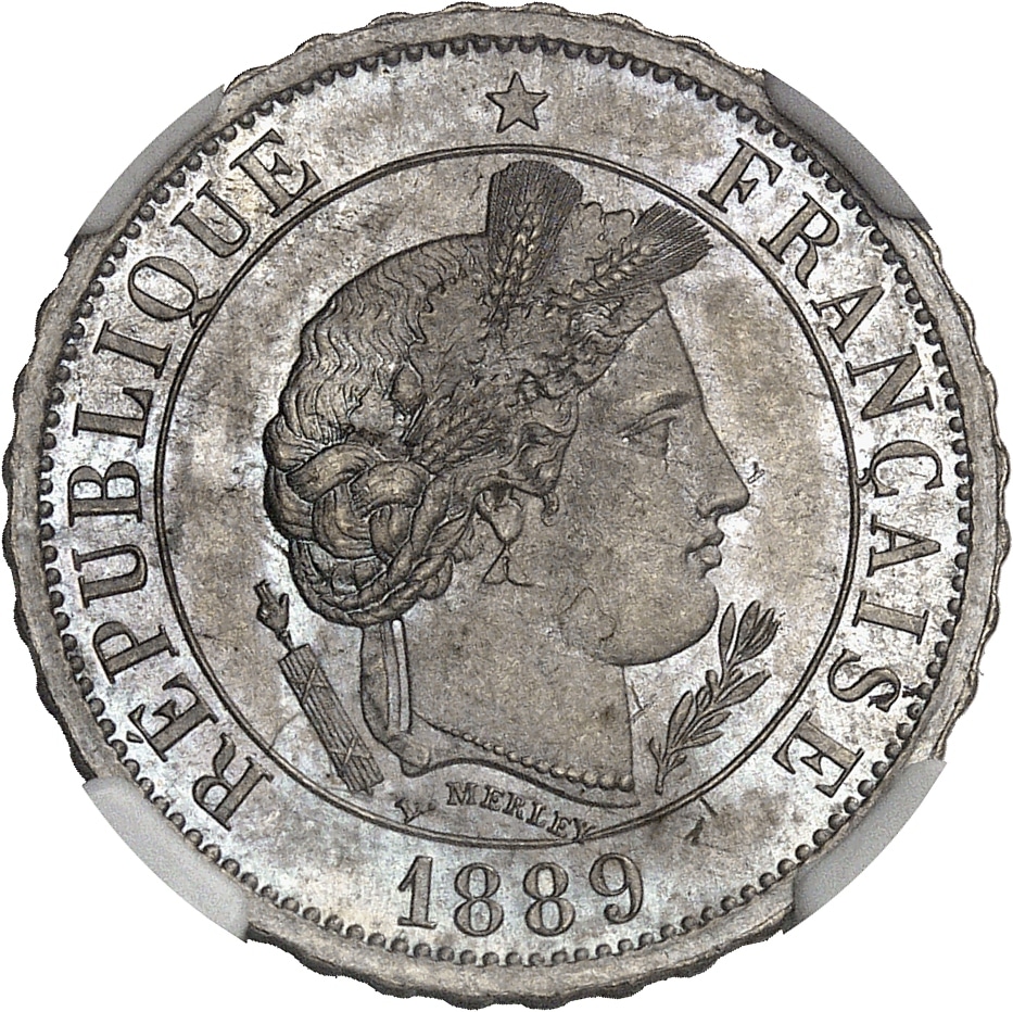 - IIIe République (1870-1940). Essai de 20 centimes Merley, 2e type, avec faisceau et rameau, flan à 40 lobes 1889, A, Paris.