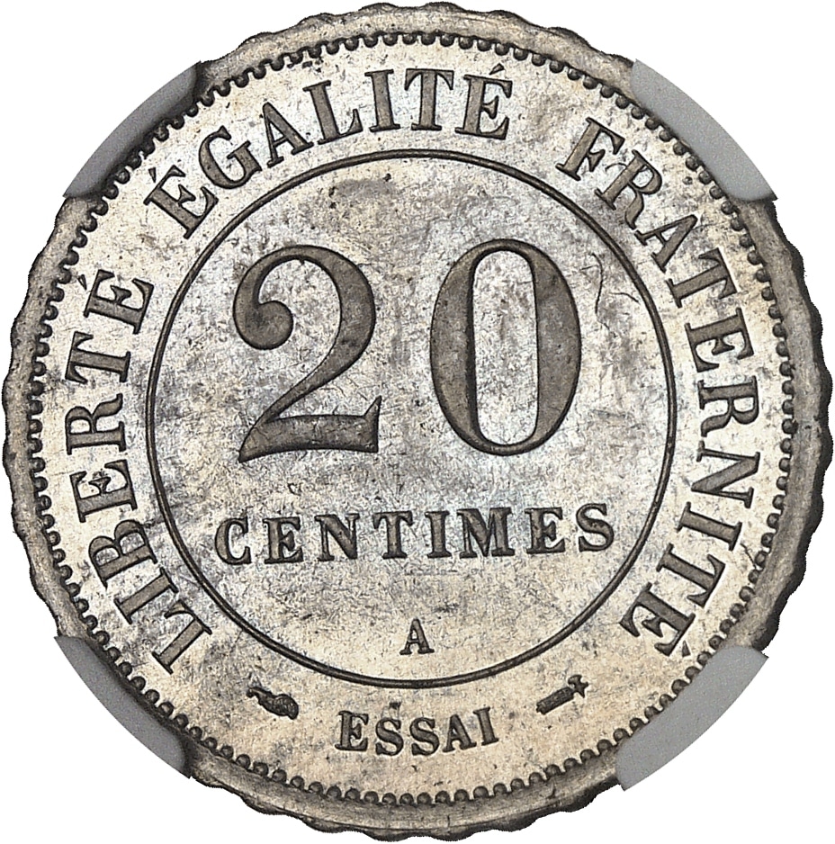Rv. LIBERTÉ ÉGALITÉ FRATERNITÉ. Au centre : 20 CENTIMES (atelier) et à l’exergue (différent) ESSAI (différent).