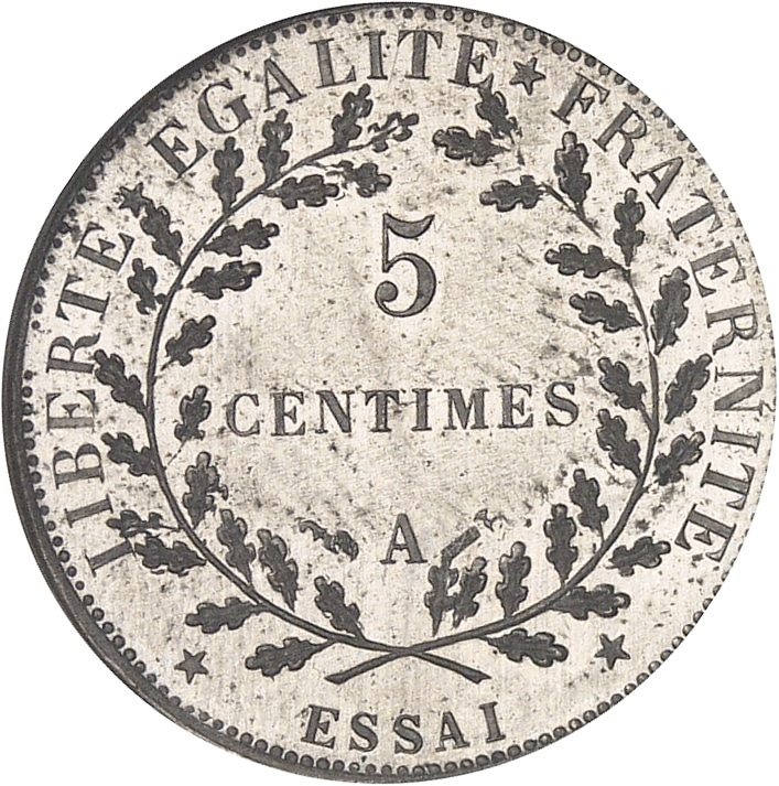 Rv. LIBERTÉ ÉGALITÉ FRATERNITÉ. Dans une couronne formée de deux branches de chêne : 5 CENTIMES (différent) (atelier) (différent) et au-dessous ESSAI.