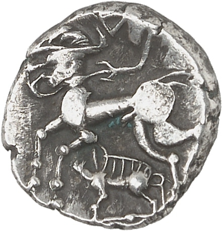 C’est la division du “statère au sanglier, classe I au décor sur la joue, var. 2”, sans décor sur la joue au droit. Légèrement nettoyé. TTB.