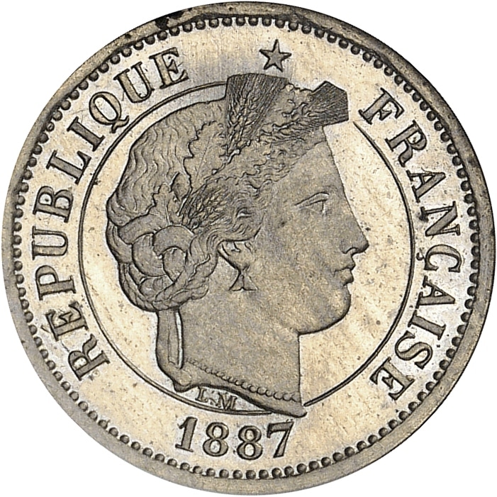 - IIIe République (1870-1940). Essai de 5 centimes Merley, 2e type, sans faisceau ni palme, flan polygonal à 16 pans, avec la grosse tête 1887, A, Paris.
