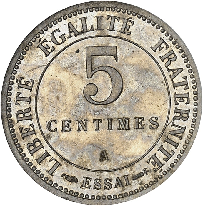 Rv. LIBERTÉ ÉGALITÉ FRATERNITÉ. Au centre : 5 CENTIMES (atelier) et à l’exergue (différent) ESSAI (différent).