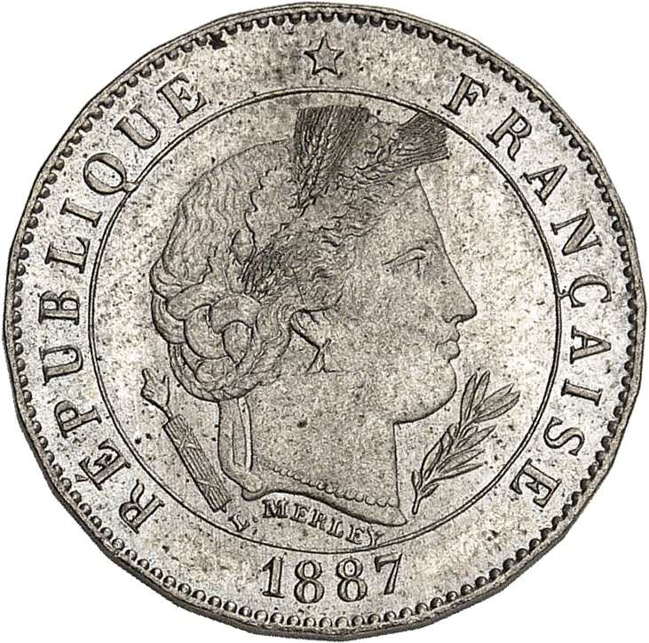- IIIe République (1870-1940). Essai de 5 centimes Merley, 2e type, flan polygonal à 24 pans, Frappe spéciale (SP) 1887, A, Paris.