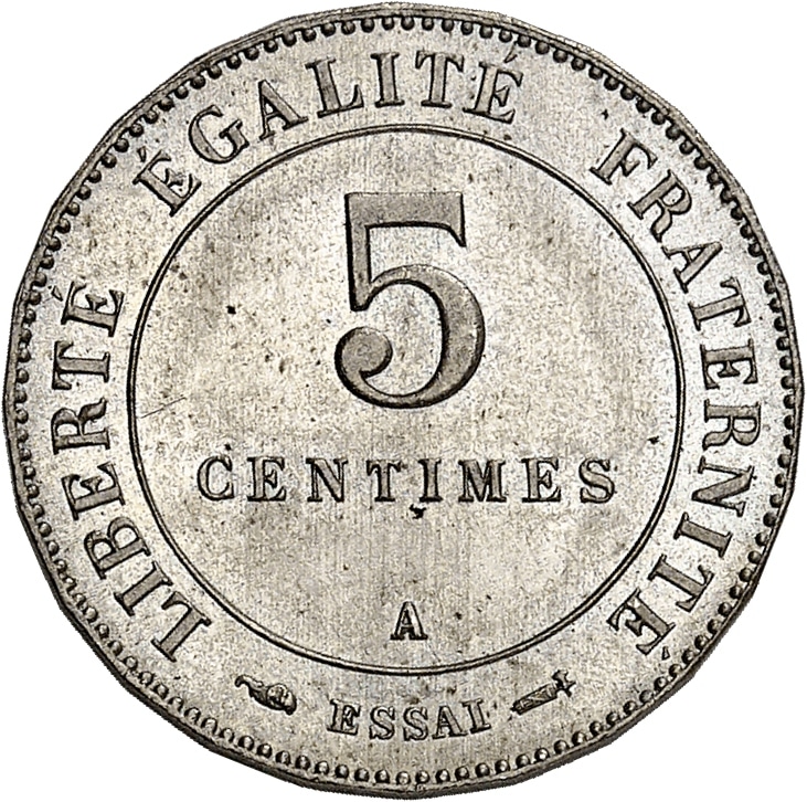 Rv. LIBERTÉ ÉGALITÉ FRATERNITÉ. Au centre : 5 CENTIMES (atelier) et à l’exergue (différent) ESSAI (différent).