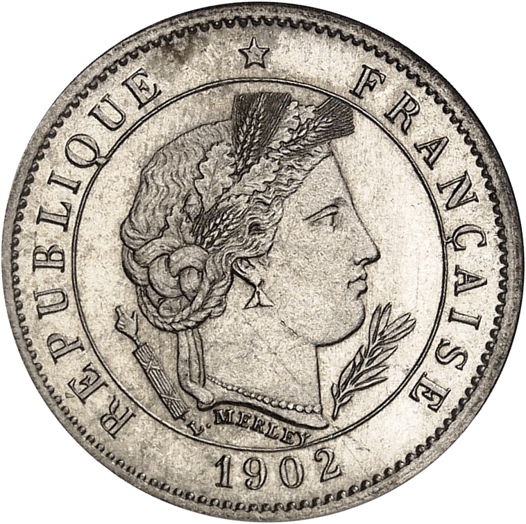 Av. RÉPUBLIQUE * FRANÇAISE. Dans une cuvette, tête couronnée de la République à droite, avec collier de perles, entre un faisceau et une branche d’olivier ; au-dessous signature arrondie L. MERLEY et à l’exergue (date).
