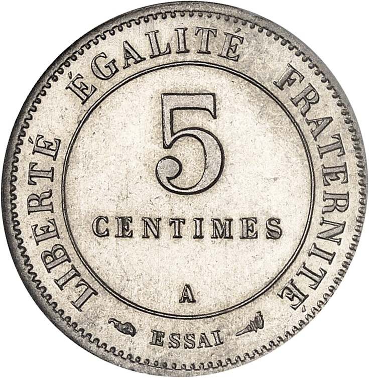 Rv. LIBERTÉ ÉGALITÉ FRATERNITÉ. Au centre : 5 CENTIMES (atelier) et à l’exergue (différent) ESSAI (différent).