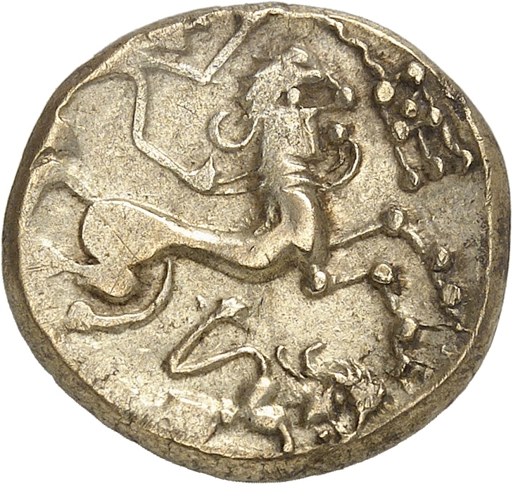 - CELTIC Riedones ou Aulerques Cénomans. Statère au personnage couché, avec le bras en V ND (IIe s. avant J.-C.).