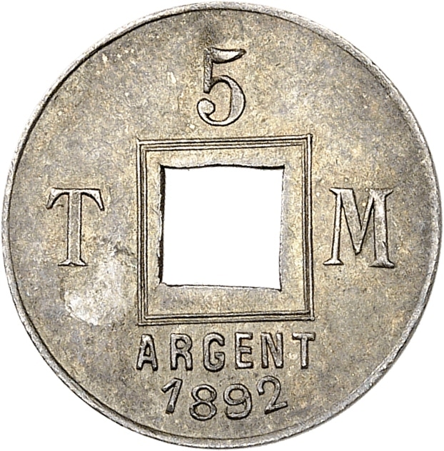 Rv. Autour de la perforation carrée centrale : 5 / T / M / ARGENT et (date).