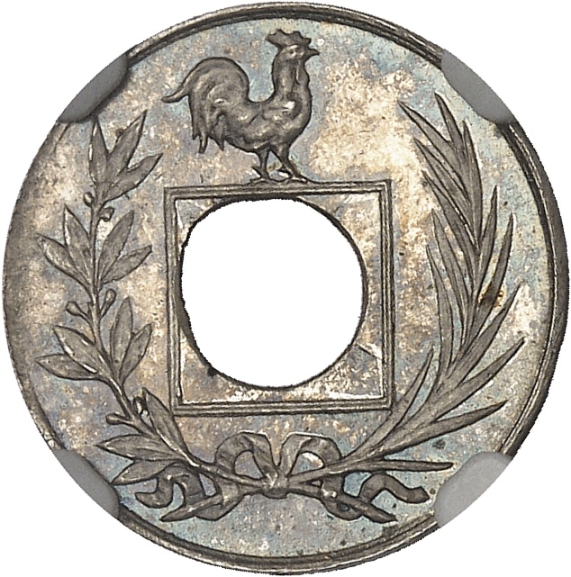 NGC MS 65 (3160169-004). Variété inédite (?) avec une perforation centrale ronde ! Un poinçon peu lisible (corne ?) et décalé sur la tranche à 8 h au revers. Jolie patine aux reflets bleutés. Presque Fleur de coin.