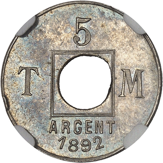 Rv. Autour de l’emplacement de la perforation carrée centrale, avec perforation ronde : 5 / T / M / ARGENT et (date).