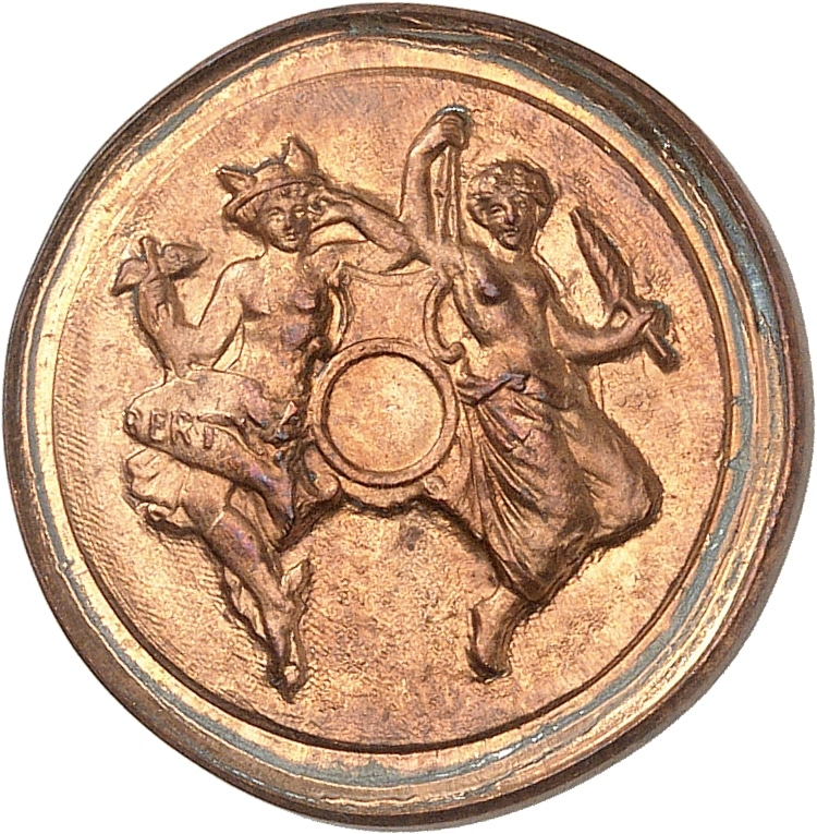 Rv. Autour du trou central rond, Mercure représentant le Commerce et allégorie représentant l’Industrie.