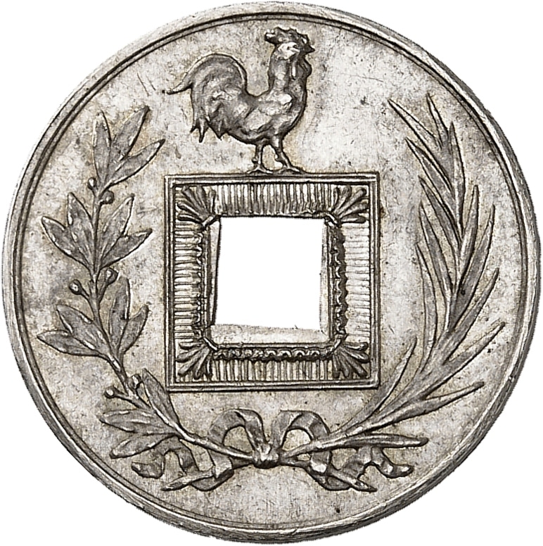 Av. Autour de la perforation carrée centrale : une couronne formée d’une palme et d’une branche de laurier et au-dessus un coq à droite.