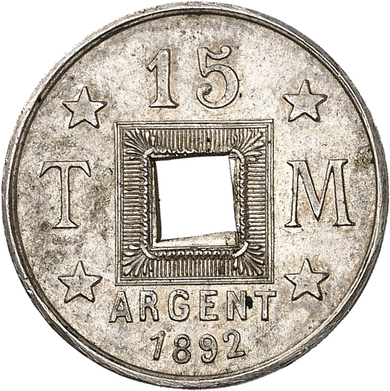 Rv. Autour de la perforation carrée centrale : 15 / T / M / ARGENT et (date) avec 4 étoiles dans les angles du carré.