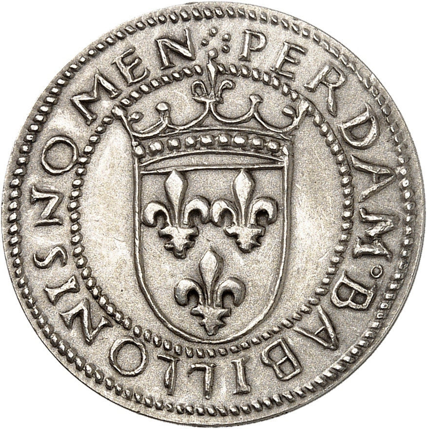 Rv. PERDAM BABILLONIS NOMEN [J’anéantirai jusqu’au nom de Babylone]. Écu de France couronné dans un grènetis.