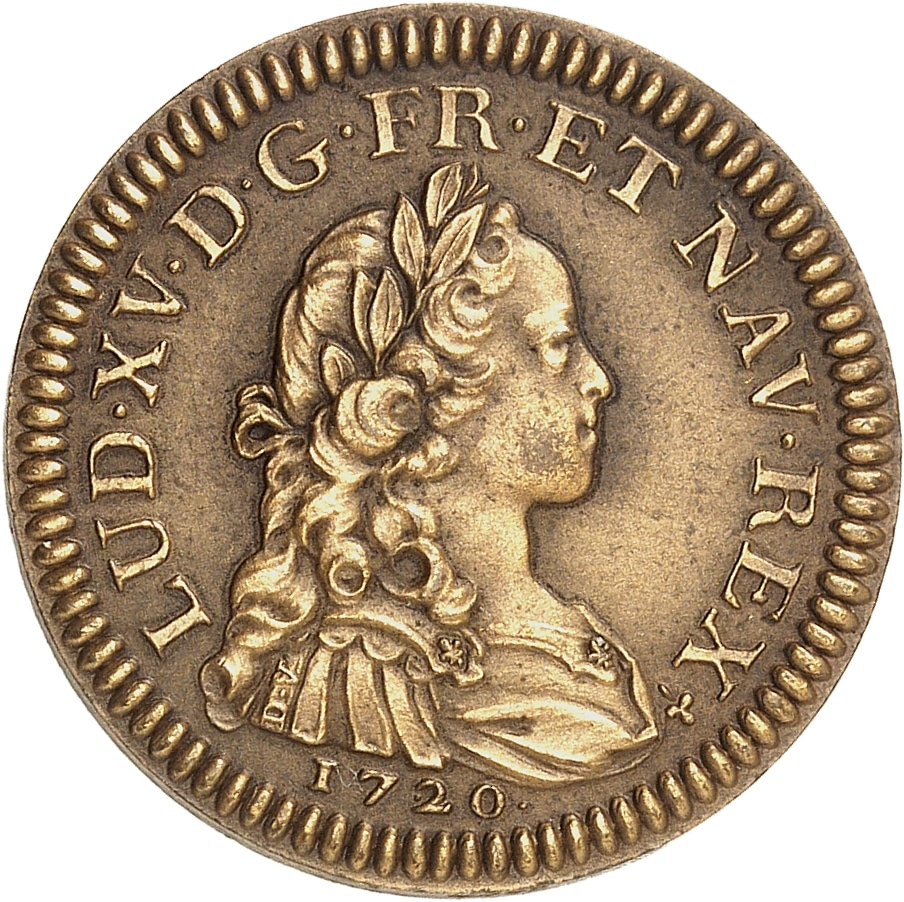 - IIIe République (1870-1940). Essai de frappe au module du Louis d’argent de Louis XV, en bronze, Frappe spéciale (SP) [1720], frappe moderne, Paris.