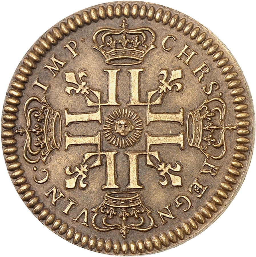 Rv. CHRS. - REGN. - VINC. - IMP. Croix formée de huit L adossées deux à deux, chaque bras étant couronné, une tête rayonnante au centre.