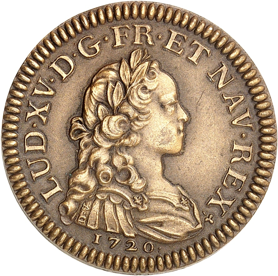 - IIIe République (1870-1940). Essai de frappe au module du Louis d’argent de Louis XV, en bronze, Frappe spéciale (SP) [1720], frappe moderne, Paris.