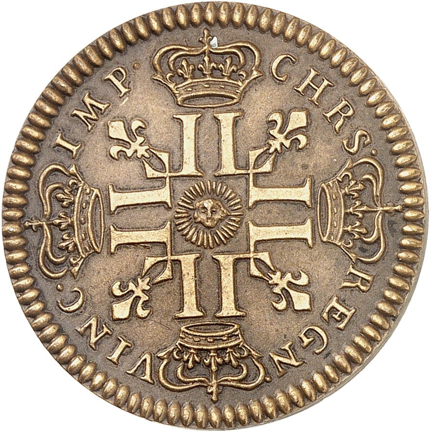 Rv. CHRS. - REGN. - VINC. - IMP. Croix formée de huit L adossées deux à deux, chaque bras étant couronné, une tête rayonnante au centre.
