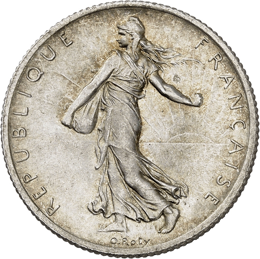 Av. REPUBLIQUE FRANÇAISE. La Semeuse à gauche, avec le soleil levant, marchant et semant à contre-vent ; signature O. ROTY.