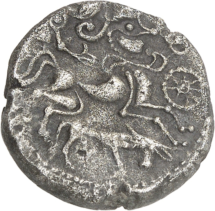 Rv. Cheval androcéphale à droite, conduit par son aurige tenant les rênes ; une roue perlée devant le cheval ; un taureau à droite, à la tête de face, au-dessous.