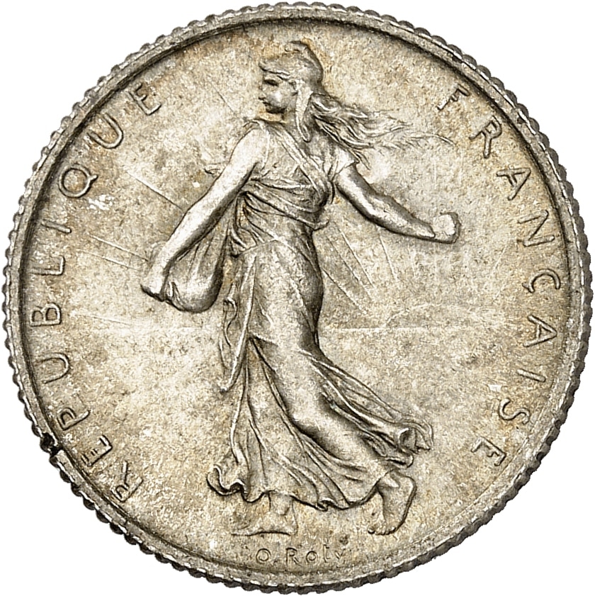 Av. REPUBLIQUE FRANÇAISE. La Semeuse à gauche, avec le soleil levant, marchant et semant à contre-vent ; signature O. ROTY.
