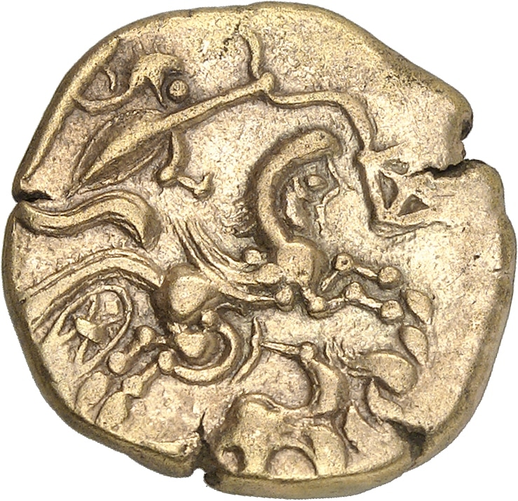 Av. Tête laurée à droite la chevelure de type armoricain, avec une sorte de chignon sur l'arrière de la tête ; une boucle de cheveux devant le front et une boucle d'oreille sur la joue.