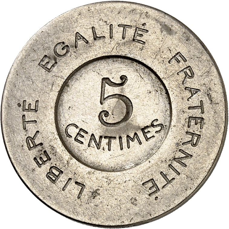 Rv. LIBERTÉ ÉGALITÉ FRATERNITÉ. Dans une cuvette circulaire : 5 CENTIMES.